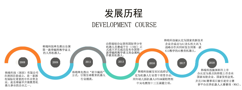 ABOUT US韓端科技(品牌:韓端、MY ROBOT TIME),于2008年在深圳成立,公司根植智能教育硬件賽道已經(jīng)14年之久,是深圳也是中國最早專注于這個(gè)細(xì)分領(lǐng)域的本土品牌之一。公司致力于向海內(nèi)外用戶提供以智能教育機(jī)器人為教學(xué)載體,覆蓋全學(xué)齡段的智能教育硬件產(chǎn)品和課程體系,是中國領(lǐng)先的機(jī)器人和人工智能編程教育產(chǎn)品技術(shù)服務(wù)商,也是我國青少年科學(xué)素質(zhì)教育行業(yè)的拓荒者之一。公司是教育部全國信息技術(shù)標(biāo)準(zhǔn)化技術(shù)委員會單位委員,中國教育技術(shù)協(xié)會人工智能專委會發(fā)起單位、北京大學(xué)學(xué)習(xí)科學(xué)實(shí)驗(yàn)室深度合作單位、國際青少年機(jī)器人協(xié)會(聯(lián)合國NGO理事會觀察員)創(chuàng)始單位。