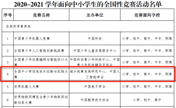 教育部公布的2020-2021學年面向中小學生的全國性競賽活動名單,名單分為“自然科學素養類”“人文綜合素養類”“藝術體育類”三類,共有“全國中小學信息技術創新與實踐大賽(NOC)”等多項科技競賽進入白名單。