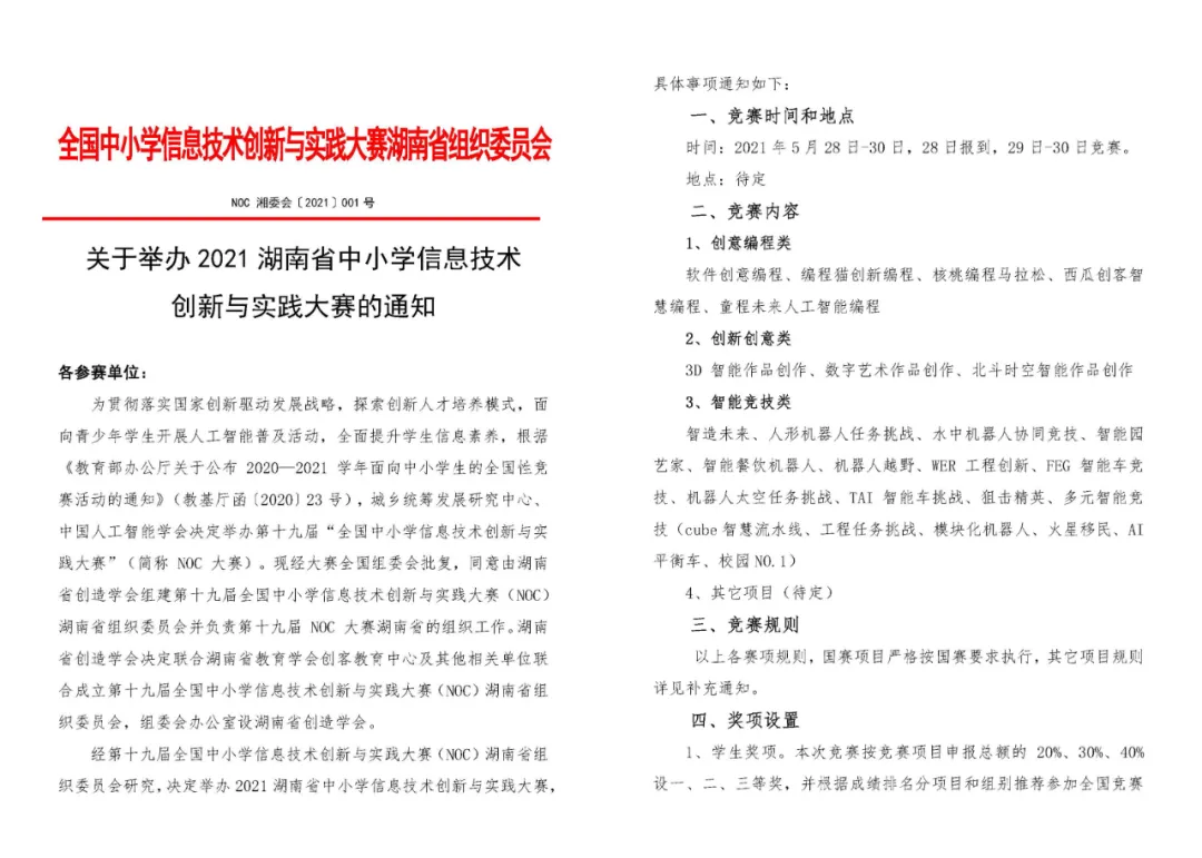“全國中小學信息技術創新與實踐大賽”是一項運用信息技術,培養廣大師生的創新精神和實踐能力,面向青少年學生開展人工智能科學普及、引領科技創新的素質教育實踐平臺,簡稱NOC大賽(NOC為Novelty, Originality, Creativity的縮寫)。