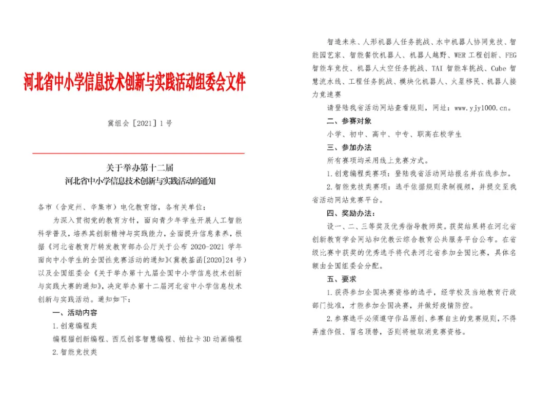 4月6日,NOC全國組委會正式發布《關于舉辦第十九屆全國中小學信息技術創新與實踐大賽的通知》(全組委函【2021】1號文),韓端為NOC機器人越野賽承辦單位!歡迎踴躍報名參加教育部白名單賽事!