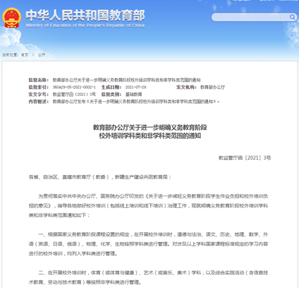 7月24號,中共中央辦公廳、國務(wù)院辦公廳印發(fā)《關(guān)于進(jìn)一步減輕義務(wù)教育階段學(xué)生作業(yè)負(fù)擔(dān)和校外培訓(xùn)負(fù)擔(dān)的意見》(以下簡稱“雙減”意見)并發(fā)出通知,要求各地區(qū)各部門結(jié)合實際認(rèn)真貫徹落實。