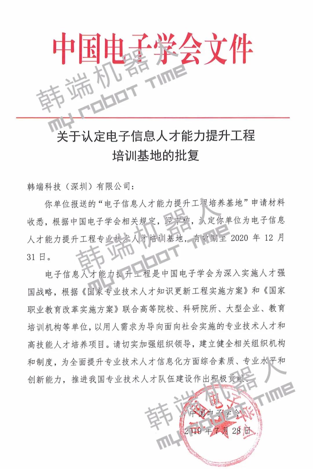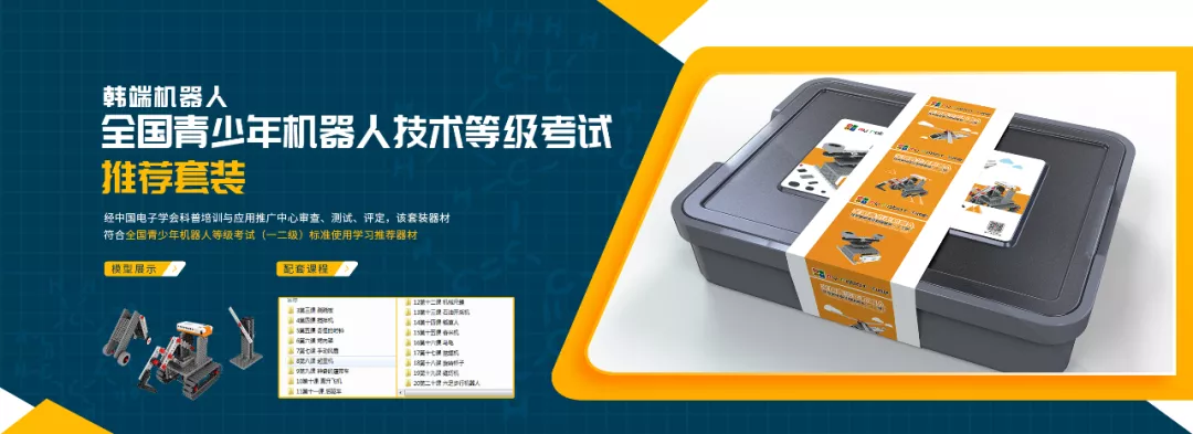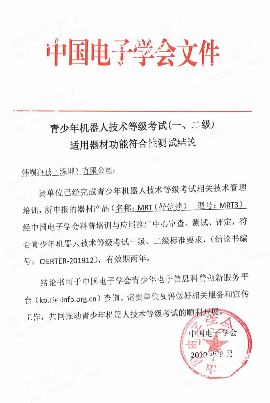 2019年韓端機器人產(chǎn)品經(jīng)評審被認(rèn)定為全國青少年機器人技術(shù)等級考試符合性器材,以下為電子學(xué)會授權(quán)文件以及1-2級等級套裝簡介: