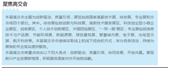 舉辦單位:高交會組委會【由商務部、科技部、工信部、國家發改委、農業部、國家知識產權局、中國科學院、中國工程院等國家部委和深圳市人民政府共同舉辦】