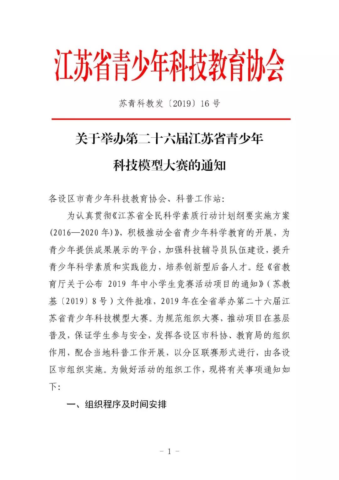 為認(rèn)真貫徹《江蘇省全民科學(xué)素質(zhì)行動計劃綱要實施方案(2016—2020年)》,積極推動全省青少年科學(xué)教育的開展,為青少年提供成果展示的平臺,加強(qiáng)科技輔導(dǎo)員隊伍建設(shè),提升青少年科學(xué)素質(zhì)和實踐能力,培養(yǎng)創(chuàng)新型后備人才。經(jīng)《省教育廳關(guān)于公布 2019 年中小學(xué)生競賽活動項目的通知》(蘇教基〔2019〕8號)文件批準(zhǔn),2019年在江蘇省全省舉辦第二十六屆江蘇省青少年科技模型大賽。