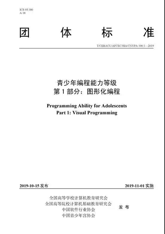 該標準共分為4部分,其中第1、2部分兩項標準將于2019年11月1日起實施,分別為第1部分:圖形化編程,第2部分:Python編程。該標準規(guī)定了青少年編程能力的等級劃分及其相關(guān)能力要求,其中第1部分給出了青少年圖形化編程能力的等級及其相關(guān)能力要求,適用于青少年圖形化編程能力教學(xué)、培訓(xùn)及考核;第2部分明確指出面向青少年計算思維和邏輯思維培養(yǎng)而設(shè)計。該標準的推出指明青少年編程教學(xué)的培養(yǎng)目的(即面向計算思維的培養(yǎng))、給出教學(xué)參考和考核標準、進行等級認證,進一步規(guī)范青少年編程教育。