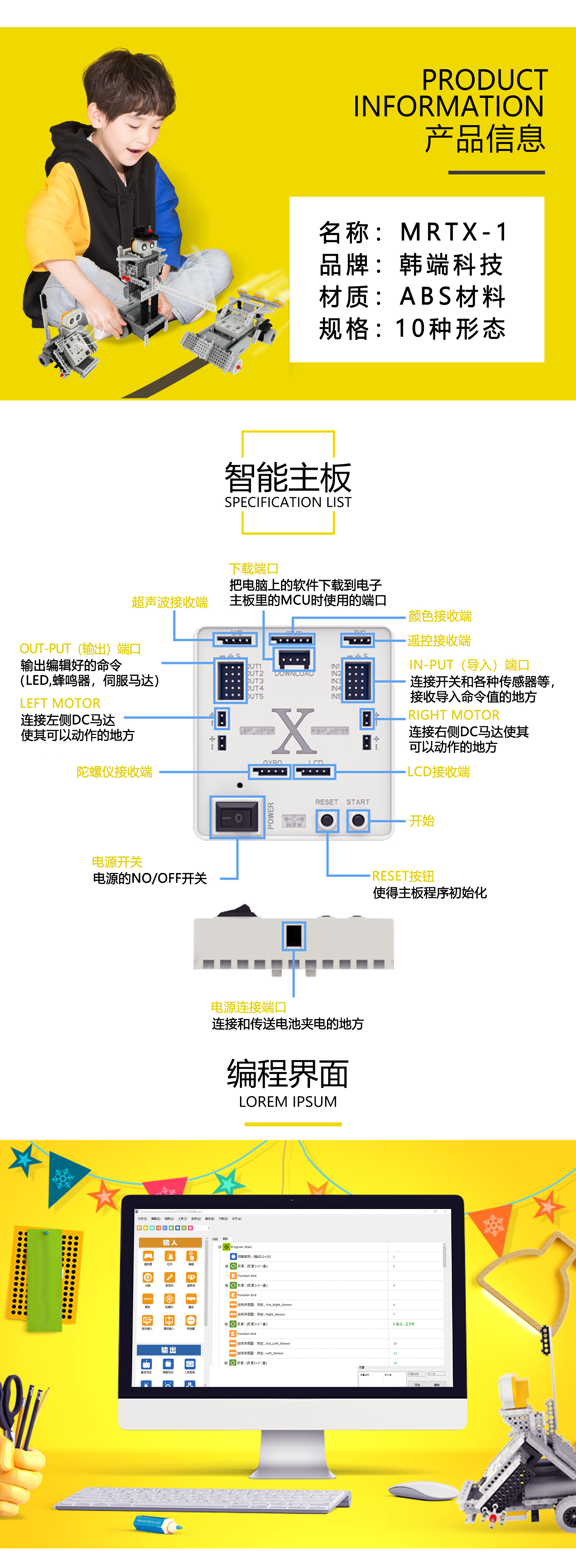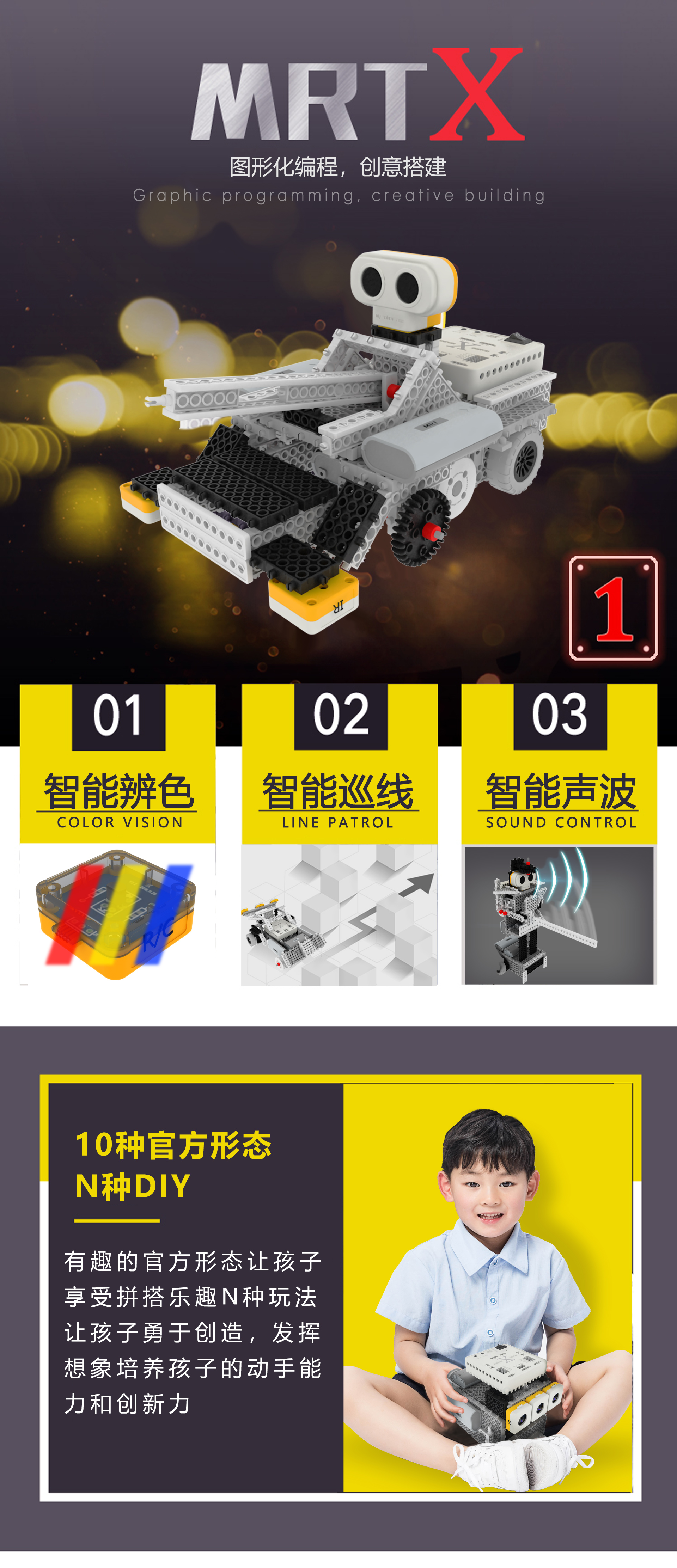 產品名稱:MRTX-1 外觀顏色:多彩積木 產品材料:ABS環保材料 模塊特性:六面體模塊 ,小顆粒 電 機:DC馬達 主 板:編程主板 模型數量:10個 額定電壓:9V 功 能:DIY 教學,動靜結合,形象生動。主板為開關控制模式,一鍵式按鈕設計讓機器人操作顯得簡潔而簡單。適合幼兒初學階段。 適用年齡:7-9歲 重 量:2KG 配 置:原始教材,超聲波傳感器,顏色傳感器,IR傳感器 包裝尺寸:寬250*厚350*高90mm