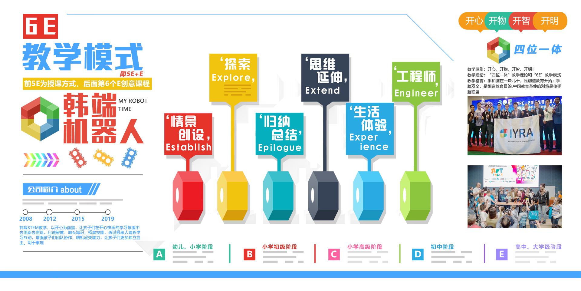 HUAN Class 系列分為三個(gè)階段,簡(jiǎn)單到難的學(xué)習(xí)過程,套裝采用小模塊、單片機(jī)主板、傳感器 創(chuàng)造出生動(dòng)形象功能不一機(jī)器人模型,通過 MY Robot Time(圖形化與代碼)編寫程序來(lái)控制機(jī)器 人完成特定的任務(wù)。結(jié)合 STEM 教學(xué)理念引導(dǎo)孩子們深入的探究聲、光、電、力的物理現(xiàn)象,培養(yǎng)孩 子們的綜合能力。
